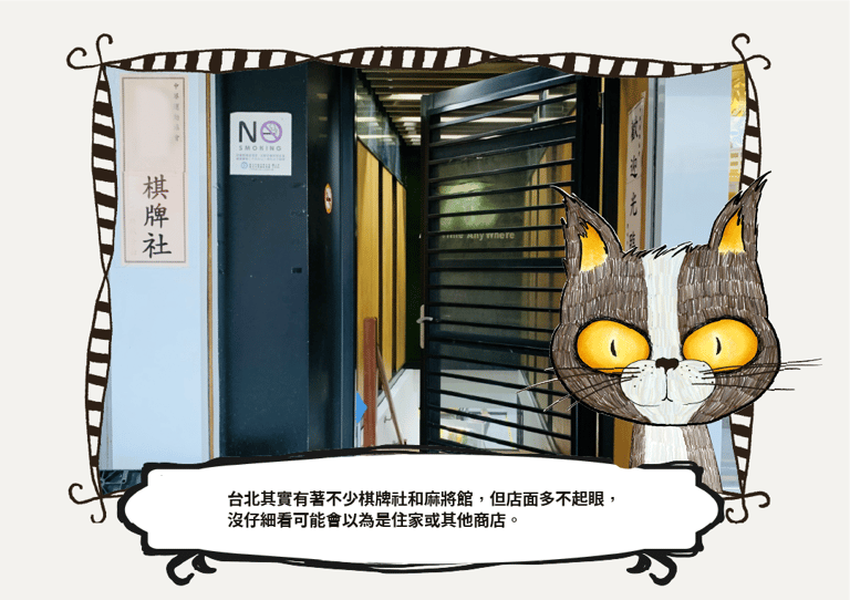 路上的機車與汽車呼嘯而過。佈滿煙蒂的騎樓旁,地上放了兩個空罐,裝滿了煙屁股。印著「XX棋牌社」的粉橘色A4紙上牢牢地黏在牆壁上,與一旁斗大的「No smoking」貼紙相隔不遠,緊鄰的是一扇鏤空的門。不說,可能會以為這扇門通往的只是影印店或足部按摩店,但它其實是一間麻將館。