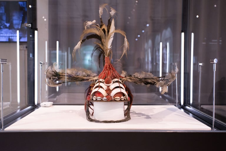 仔細觀賞大禮冠盤帽,可看到帽前鑲有貝殼串與巨型山豬獠牙,象徵著海洋與陸地。盤帽周圍成排的大冠鷲羽毛,則代表保衛部落的男性年齡階層,帽子後方還紮有人髮。大禮冠盤帽僅在主持重要祭儀時穿戴,象徵大頭目與總祭司的氣勢威望及崇高的領導地位。