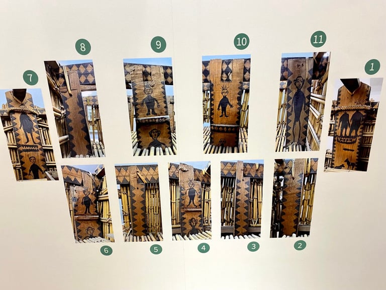 其中,大門左側編號7的祖靈柱繪製了神靈Solol ‘Alimolo與凡間妻子Lapas Ngotseh的圖像。相傳天神屬意 Lapas 做自己的兒媳,於是讓兒子Solol ‘Alimolo從天而降、藏匿於楠木中。某天,Lapas的父親聽聞山上有楠木會哀嚎,決定砍樹一探究竟。樹倒後Solol ‘Alimolo現身,告知天神指示Lapas與自己結婚。但是 Lapas 並不喜歡這個年輕人,Solol ‘Alimolo只好畏縮在大門左邊的立柱下,形成男子嫁到女方家需坐在此柱下的習俗。