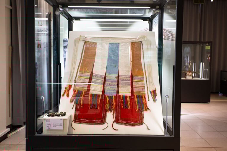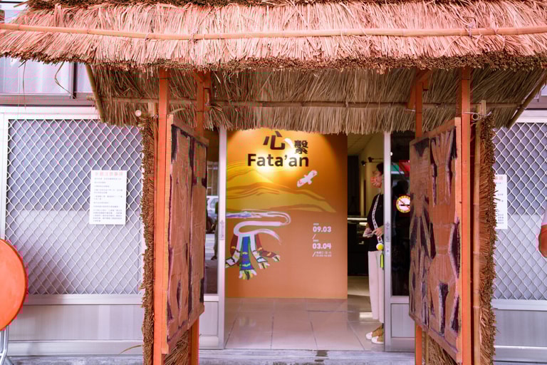 穿過族人以茅草搭建的展場入口,首先映入眼簾的是充滿朝氣的橘色主視覺,壯觀的高山流水向前延伸出 Fohkad(五片流蘇裙),這是馬太鞍男子在 Ilisin(年祭)穿著的代表性服飾。山間另有大冠鷲翱翔天際,其羽毛是製作大禮冠盤帽的重要材料。展覽呈現族人與自然共生的智慧,介紹馬太鞍特殊的物質文化與社會組織,以及部落族人與中研院合作研究的故事。