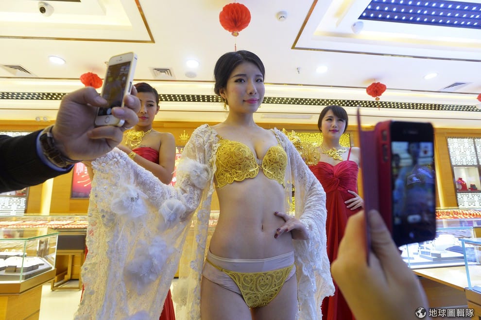 穿著黃金打造的內衣模特兒,擺出姿勢讓旁人對著她拍照。湖北省武漢市內的一家金飾店舉辦了行銷活動,他們用人民幣100萬元打造出重達3公斤的黃金內衣,這特別的內衣會作為非賣品擺在他們的店內展示。