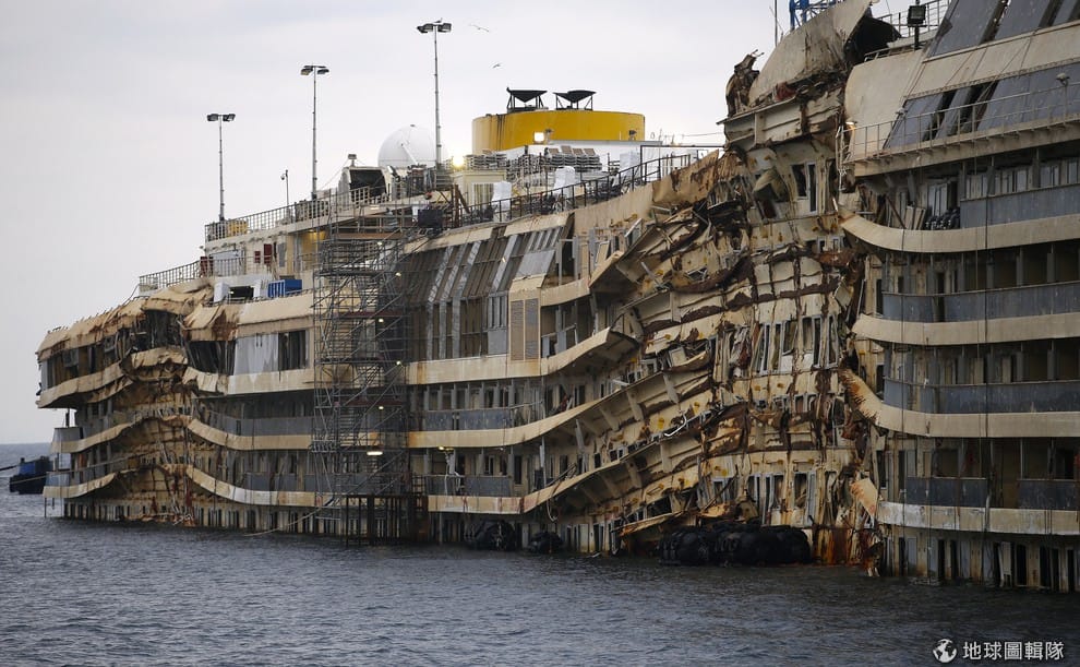 照片中是義大利「歌詩達協和號」(Costa Concordia)郵輪, 義大利吉廖島(Giglio)港口的工作人員對這艘巨型油輪進行拉索(parbuckling)技術,希望能把它扶正。在義大利海岸擱置了2年的歌詩達協和號,今年6月工作人員會將船體30個大型金屬箱充飽空氣,讓這艘巨型油輪能就此被拖走,離開卡了它2年的海岸地帶。