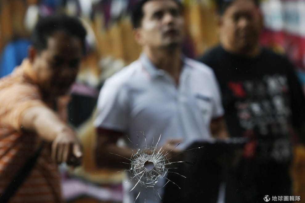 曼谷有名的背包客聚集處考山路( Khao San Road)出現檢調人員,他們正看著咖啡店窗戶上的彈痕,想釐清事件原因。週六上午,考山路出現槍手朝反政府示威者開槍,造成7人受傷,其中一名重傷。由於示威團體想在本周進行「癱瘓」首都的行動,這起事件也掀起民眾對於暴力衝突會持續升高的擔憂。