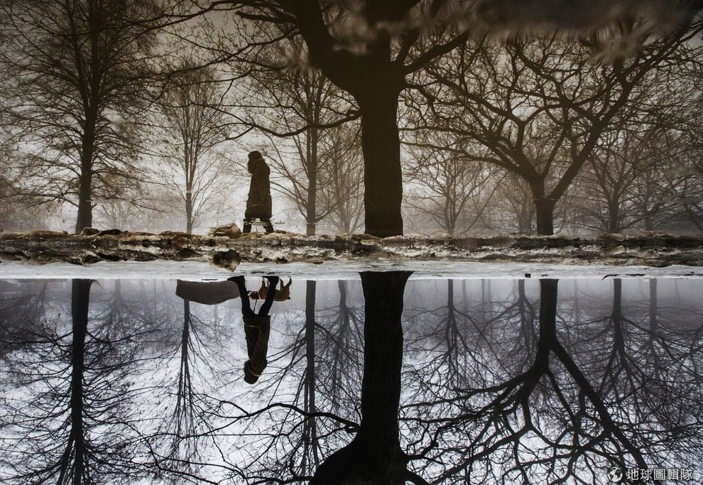 加拿大的多倫多市內,因為雨水和融雪形成的水窪倒映出一名正在遛狗的女性的身影。上週開始席捲北美地區的極地漩渦(polar vorte),侵襲美國、以及加拿大南邊一帶,大約有2.4億人的生活都受到影響。這波極地低壓緩緩遠離北美地區後,當地民眾等待已久的轉暖天氣也將降臨。
