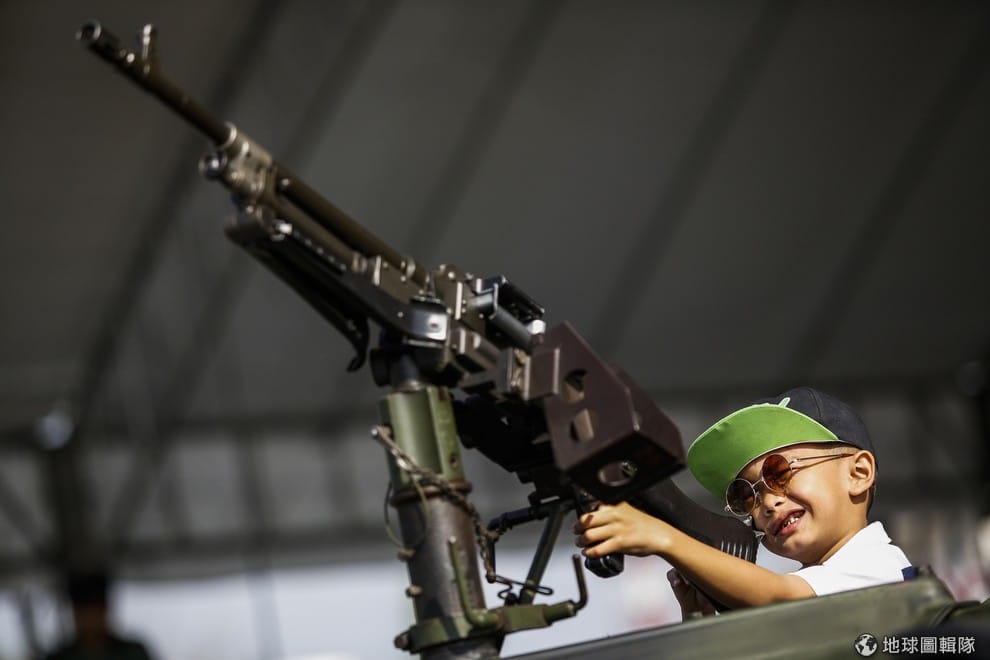 小男生正在玩一把沒有上膛的槍,他正在參加軍營中的兒童節活動。泰國的軍方領導人Prayuth Chan-ocha表示,他對於這周反政府團體將發起的「癱瘓」首都行動感到擔憂,並呼籲民眾不要發生衝突