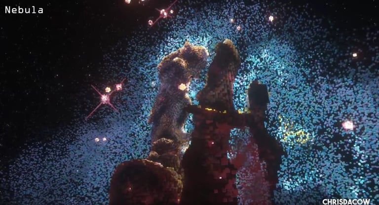 在完成太陽系之後,斯雷頓表示,他接著著手打造銀河系中的星雲(nebula),而他也坦承,一直到準備動手重現鷹星雲(Eagle Nebula)內的「創生之柱」(Pillars of Creation),那一刻才真正驚嘆到這些星際氣體與塵埃原來有多麼巨大,創生之柱的存在竟然是前面太陽系的1,175倍大。