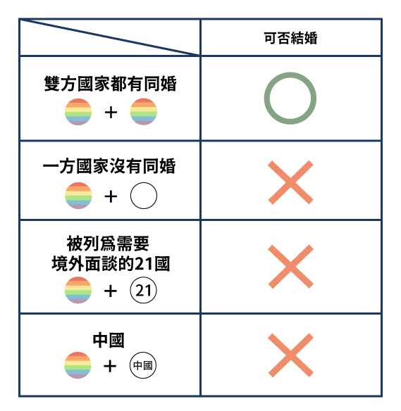 依現行法,針對印尼、菲律賓、越南、泰國等21個國家,台灣設有特別的跨國婚姻規定,要求婚姻移民抵台前要先在各國的境外外交單位進行面談,以確認「婚姻真實性」;換言之,必須先在當地完成結婚登記,才能夠完成境外面談,進一步申請在台灣登記。然而,在對方國家不承認同婚的情況下,跨國同性伴侶在第一步就已卡關。