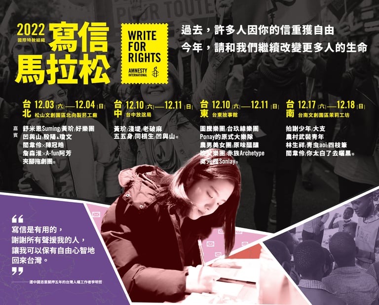 國際關注不應是只有各國政府或聯合國等國際組織才能做的事情,普通人也應該要有參與的機會,而國際特赦組織的「寫信馬拉松」正是依這個目的所發起。每年的「寫信馬拉松」,都在全球各地募集信件,支持10名需要聲援的對象。