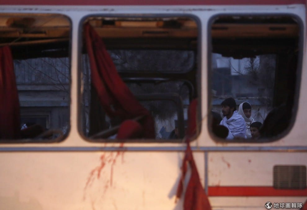 照片中的阿富汗民眾站在受自殺炸彈波及的巴士旁,喀布爾在周日(12)時受到自殺式攻擊,根據當地警方發言人表示,這波攻擊是針對警察人員,造成至少兩名警校學生死亡,多人受傷