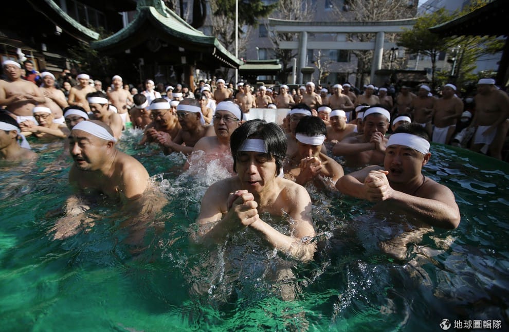 男人們在寒冬中僅穿兜檔布泡在冰水中,這是東京的鐵砲洲稲荷神社(Teppozu Inari Shrine)舉辦的「寒中禊」(Kanchu misogi)淨化祛寒祈福儀式,根據主辦單位表示,今年約有100位信眾參加,他們藉由這項儀式來淨化身心,並祈求新年健康。