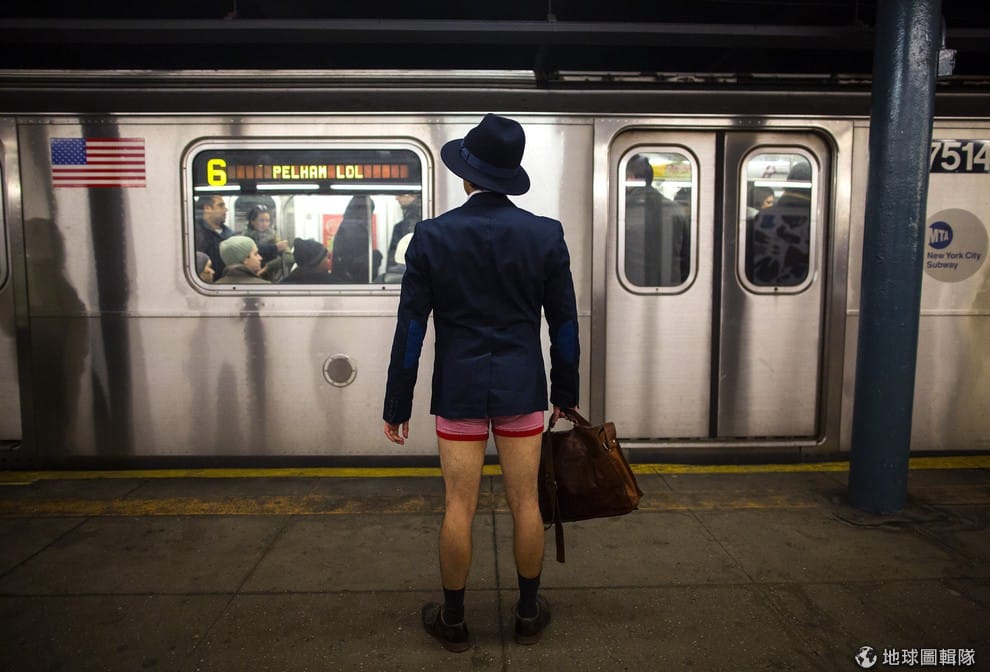紐約市的地鐵站內,可以看見一位通勤族下半身僅穿內褲等車中,12號這天是紐約的「地鐵無褲日」(No Pants Subway Ride)。