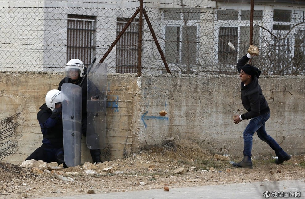 照片中的巴勒斯坦青年朝警方丟擲石塊,他們所在之處是加拉宋難民營,當地在周日的抗議活動是近期最嚴重的一次,這波抗議行動最初源自居民對聯合國難民救濟工程局(UNRWA)的薪資不滿