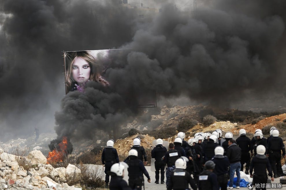 巴勒斯坦的員警們站在被示威者放火燃燒的輪胎前,他們的所在之處是距離巴勒斯坦首都拉姆安拉(Ramallah)不遠處的加拉宋難民營(Jalazoun refugee camp)。