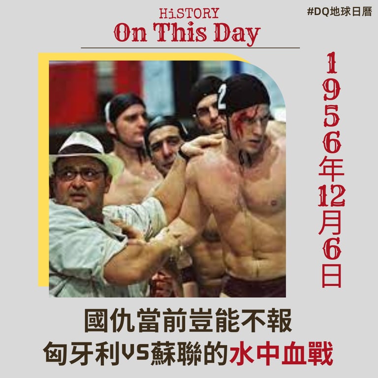 1956年12月6日,第十六屆在澳洲墨爾本舉辦的夏季奧林匹克運動會,一場匈牙利男子水球隊 VS 蘇聯男子水球隊爭奪總決賽席位的比賽中,原本肢體互動就相較激烈的水球比賽,卻在比賽「開打」後變成一場真正的水上械鬥。匈牙利球員眼角更是在被打傷、滿臉是血後,在倒數一分鐘前強行中止。這場充滿暴戾之氣的水球比賽,史稱水中血戰。而打架的理由,只因開賽前爆發匈牙利十月事件 ,蘇聯從運動場上的敵人,變成真正的敵人。