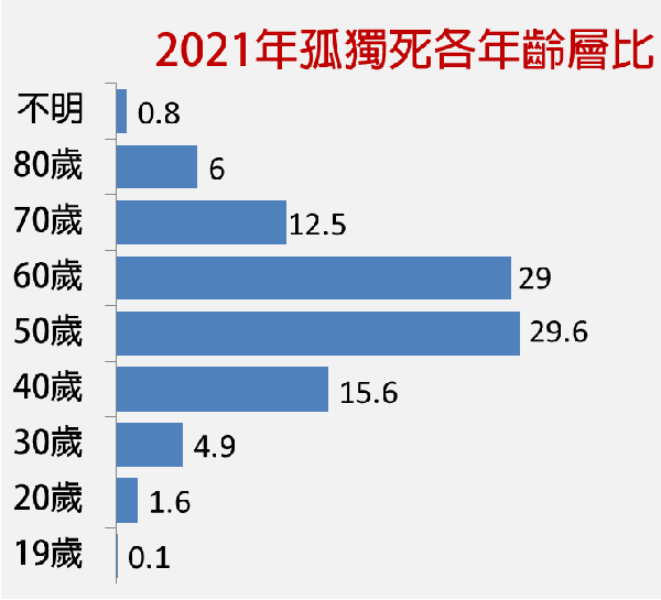 從年齡來看,去年50到60歲的死於孤獨死的人數達到58.6%;20到30歲族群比重雖然從2017年的8.4%下降到2021年的6.5%,但是選擇自殺終結一生的比例,卻也隨著年齡上升。