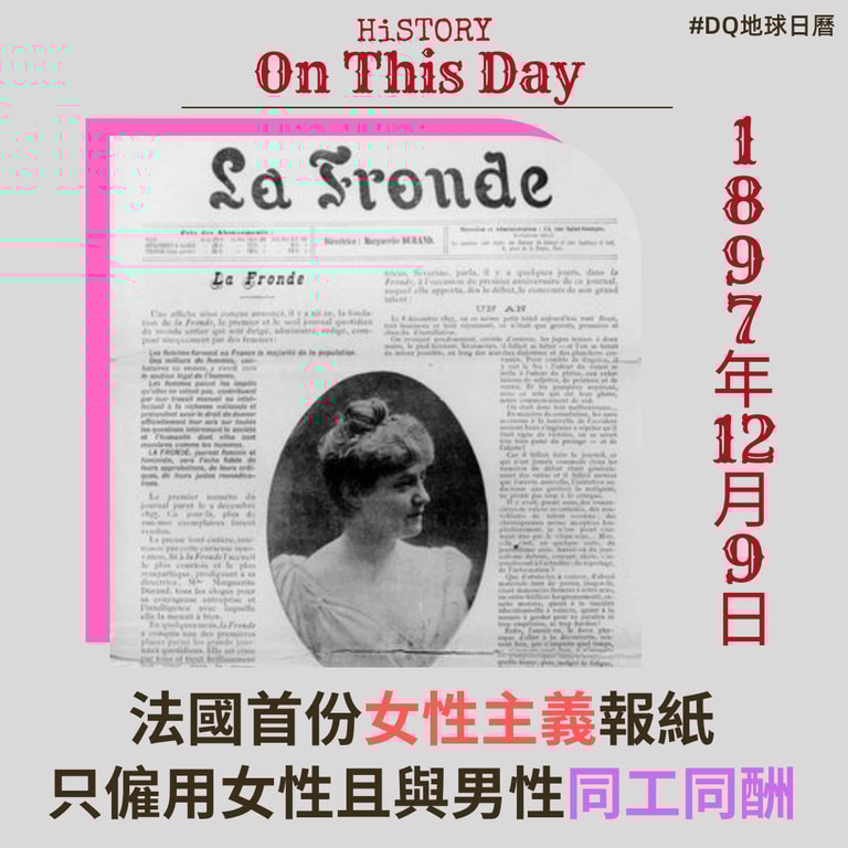 1897年12月8日,新聞記者瑪格麗特杜蘭 (Marguerite Durand)創辦法國第一份女性主義日報《La Fronde》,員工全數都是女性,同時也是繼1894年美國《女人的時代 The Woman's Era》世界上第二份由女性出版的報紙。