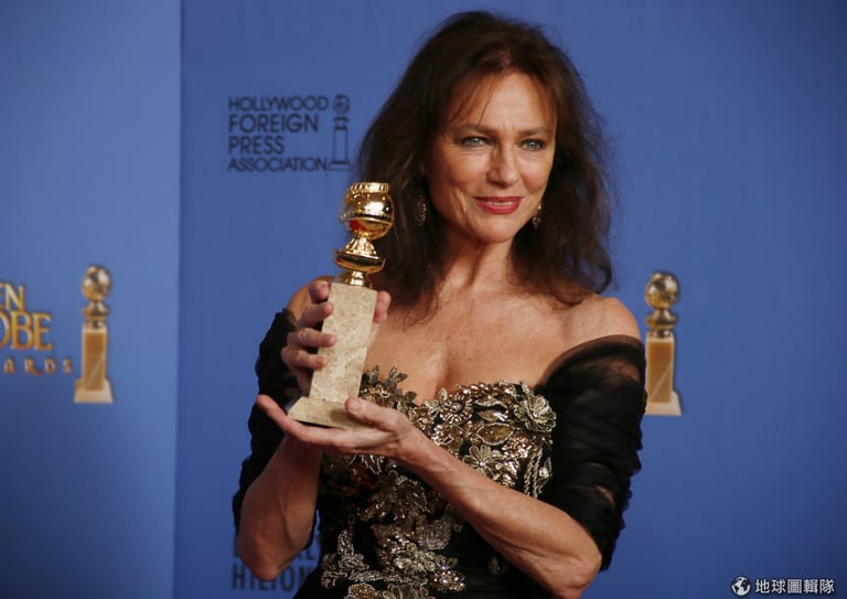 演員賈桂琳貝茜(Jacqueline Bisset)捧著獎盃拍照
