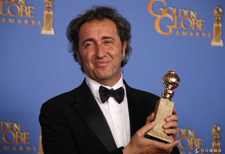 照片中《絕美之城》(The Great Beauty)的製作人尼可拉久利亞諾(Nicola Giuliano)捧著獎盃入鏡