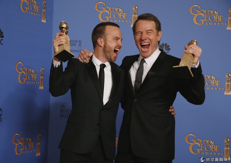 照片右邊的男性是獲得最佳戲劇影集男主角的布萊恩克蘭斯頓(Bryan Cranston)