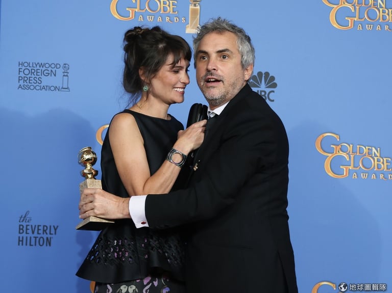 左邊的男性是獲得最佳導演獎的導演艾方索古瓦龍(Alfonso Cuaron),得獎的他與編劇 Sheherazade Goldsmith開心相擁。