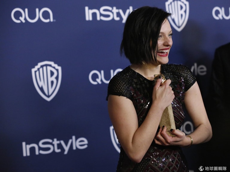 得到最佳迷你影集或電視電影女主角獎的伊莉莎白莫斯(Elisabeth Moss)抱著獎盃笑開懷