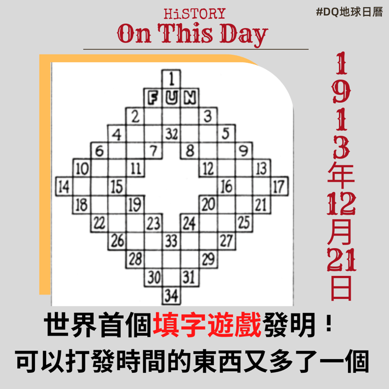 在翻閱報紙時一定有一種人,最先注意的不是頭版新聞,而是會先找填字遊戲在哪一頁。1913年12月21日,《紐約世界報》的總編要求Arthur Wynne在趣味版的「智力遊戲」區發明一款新的遊戲,而他決定參考小時候常玩的魔術方陣(Magic Squares),只是將數字換成了字母,並為每個單詞的謎題提供線索,世界上第一個填字遊戲(Crossword)就此誕生。