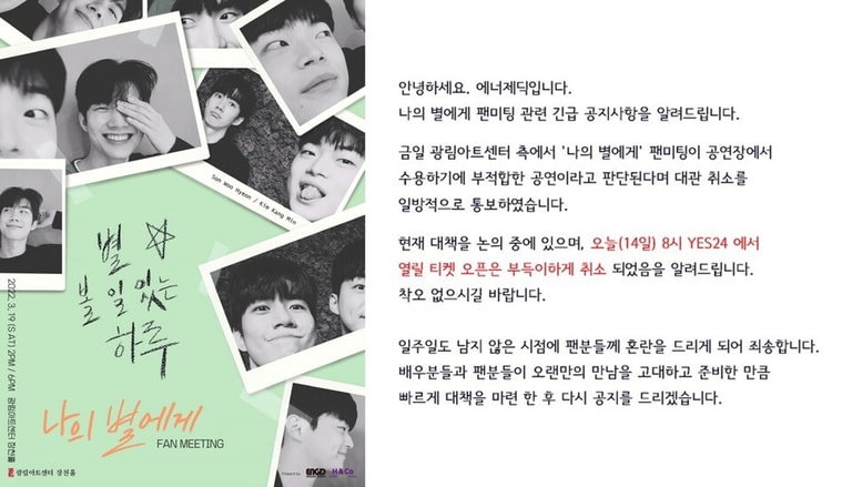而《To My Star 致我的星星》原定於2022年3月19日,於光林藝術中心舉辦粉絲見面會,卻在活動前不到一週收到BL劇活動是「不合適的演出」,迫使製作單公司不得不臨時更換場地。光林藝術中心是韓國光林教會經營的表演中心,因此,許多人也質疑這是宗教的惡意打壓與歧視。