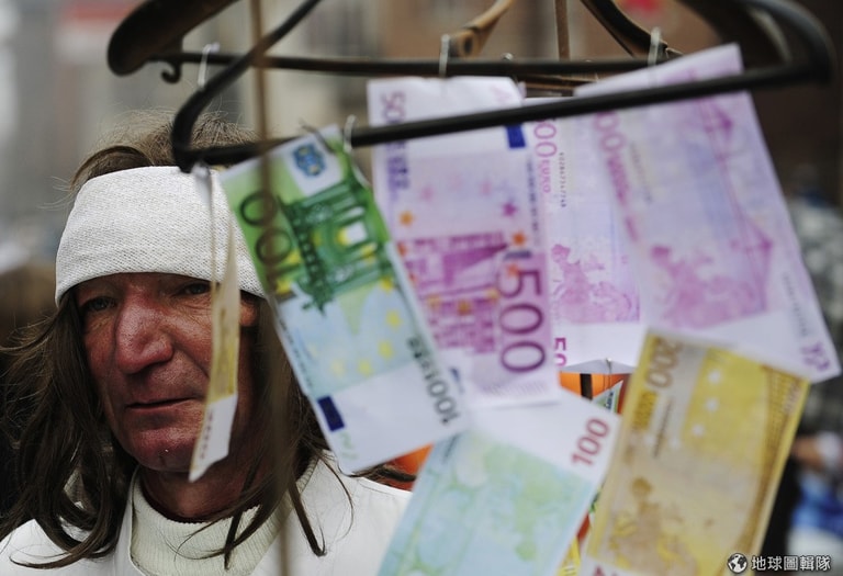 頭上綁著白布條的男人和吊掛的歐元鈔票。