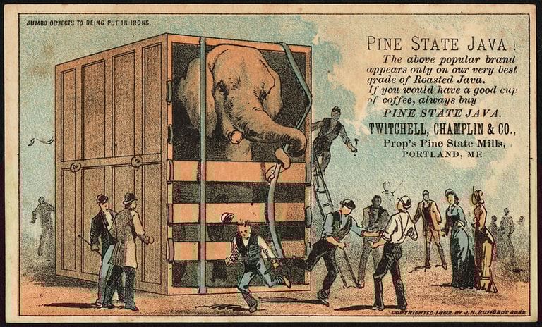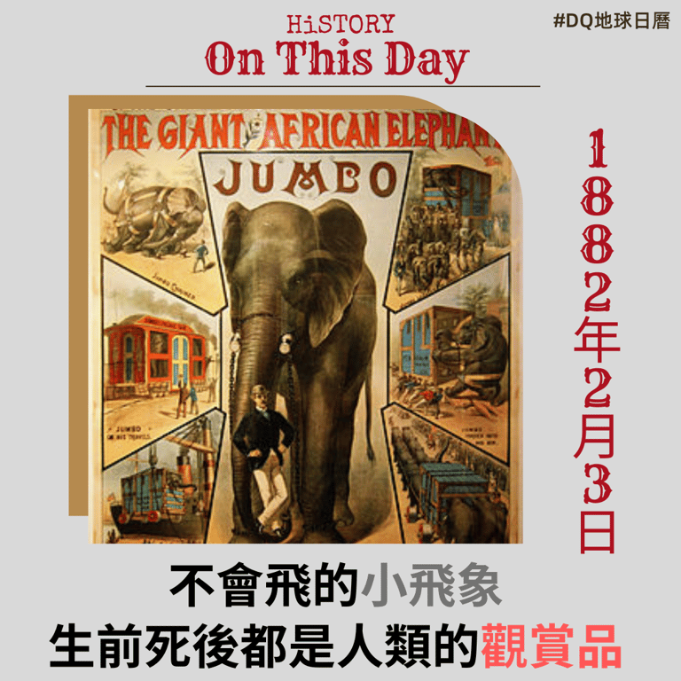 1882年2月3日,美國知名馬戲團經紀人費尼爾司·泰勒·巴納姆(P. T. Barnum)以2,000英鎊的價格,向倫敦動物園買下這隻被譽為世界上最大的大象JUMBO,牠是動畫電影《小飛象》的原型,但其真實一生卻是被人類殘忍對待的悲劇。