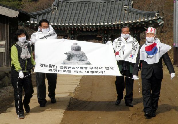 2013年2月,韓國浮石寺突然向大田地方法院提起訴訟,稱其中一座「觀世音菩薩坐像」內部寫有天歷3年(1330)高麗瑞州浮石寺的文書,以製造地來看確實是Made in Korea,之所以會在日本發現,那是因為600年前遭日本「倭寇」竊走的。