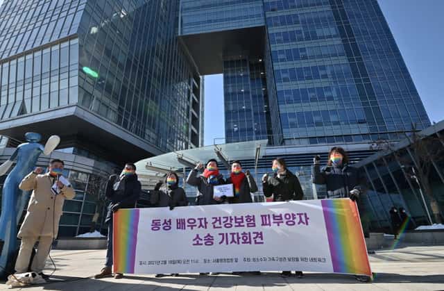LOOK: South Korean same-sex couple So Seong-wook and Kim Yong-min attend a press conference as they file a lawsuit against the National Health Insurance Service for their dependent family status, at the Seoul Administrative Court in Seoul on Feb. 18. | 📷Jung Yeon-je / AFP pic.twitter.com/zJdW2AXHiw