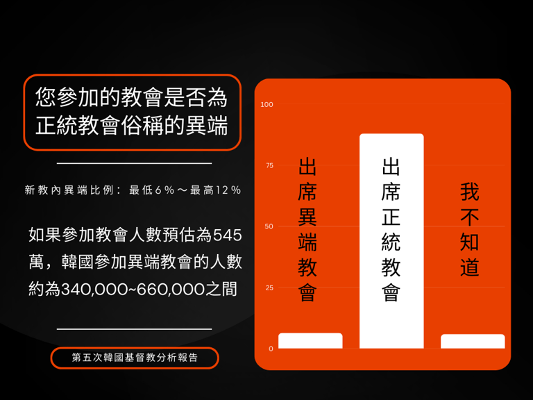 時至今日,根據2021年韓國「第五次韓國基督教分析報告」顯示,新教徒中異端信徒的佔比最低為6%,最高則為12%,換句話說,有出席教會的韓國人,每十人中就有一人是異端信徒;韓國可能有高達66萬人都是異端信徒。