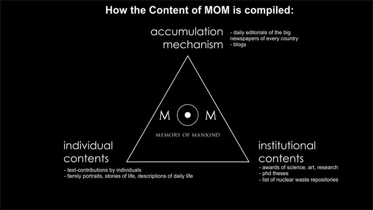 MOM計畫就如一個橫跨數十年至數千年的時空膠囊,在人類面對全球暖化、核武等等威脅文明存續的重大事件時,保存這些經歷就像是一種備份。