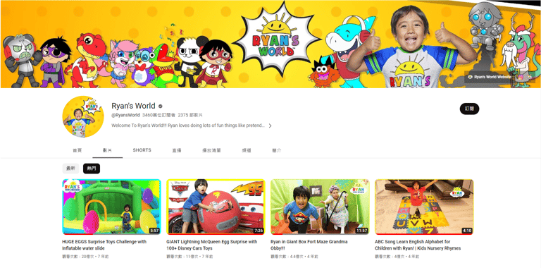 年僅11歲的瑞安卡吉(Ryan Kaji),在YouTube開設介紹玩具等知識性兒童頻道的Ryan's World,光是業配和影片收入就超過3億美元的收入,更是連續三年蟬聯《富比士》雜誌全球YouTuber收入榜首,成為全球最年輕也是賺最多的YouTuber。