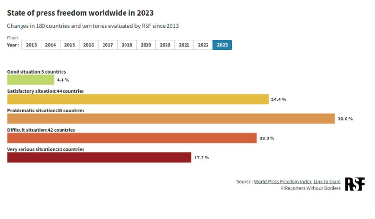 根據今年的報告顯示,僅有8個國家「狀況良好」、44個國家「狀況尚可」,其餘有55個國家「問題顯著」、42個國家「狀況艱難」、31個國家「狀況惡劣」。換句話說,在10個國家當中,約有7個國家的新聞產業環境都大有問題。