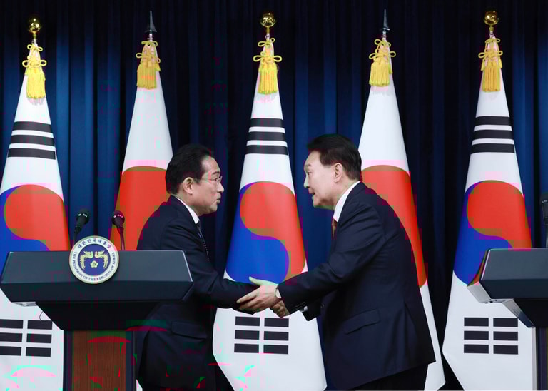 日韓兩國因歷史爭議失和已久,近期由於國際局勢影響,雙方關係才終於破冰。今年3月16日,尹錫悅首度到訪日本;昨日峰會中,岸田文雄又邀請尹錫悅參加5月中在日本舉辦的七大工業國集團(G7)領袖峰會,日韓元首在短短2個月內將三度會面,似乎有望恢復兩國過往的頻繁交流。