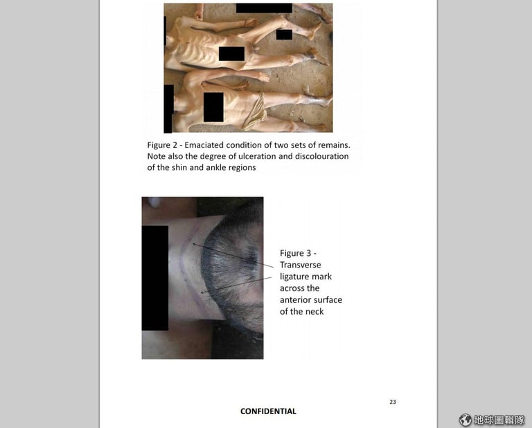 有的人少了雙眼、有的可以看見青紫色的勒痕或是電燒過的潰爛皮肉,在在都顯示出他們在生前遭受了極不人道的虐待。