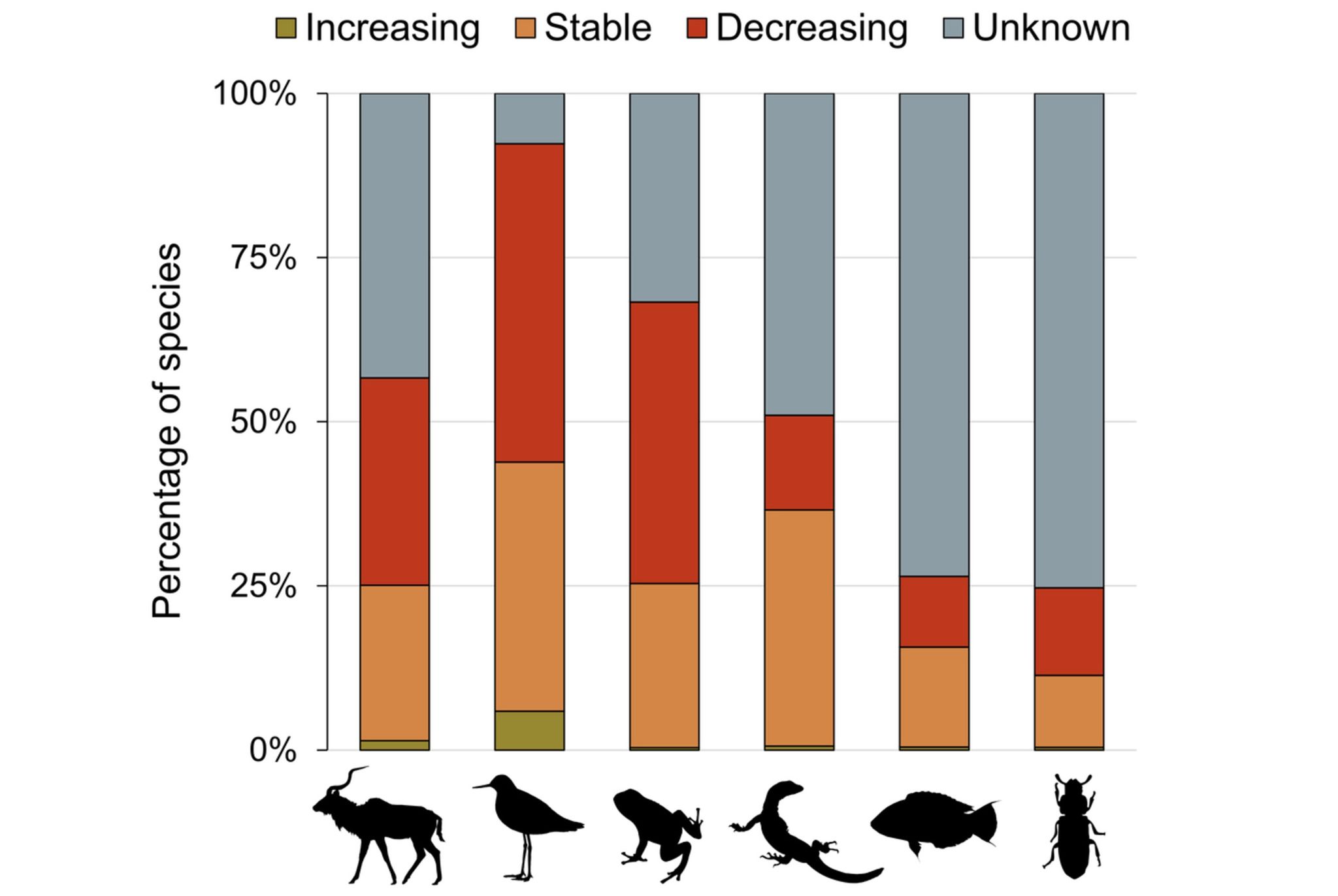 這篇新研究中,研究人員分析全球超過71,000個動物物種,包括哺乳類、鳥類、爬蟲類、兩棲類、魚類以及昆蟲,評估族群增長狀況。研究結果發現,其中有49%的族群數量穩定、48%正在減少,僅3%族群數量增加,這可能會對生態系統產生嚴重影響。