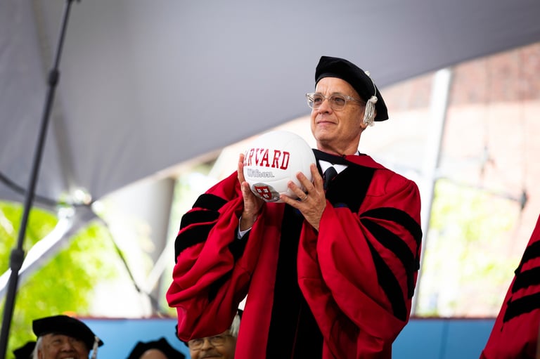 典禮中,湯姆漢克斯也被授予哈佛榮譽文學博士學位,並獲贈一顆印有哈佛校名的 Wilson 排球。
