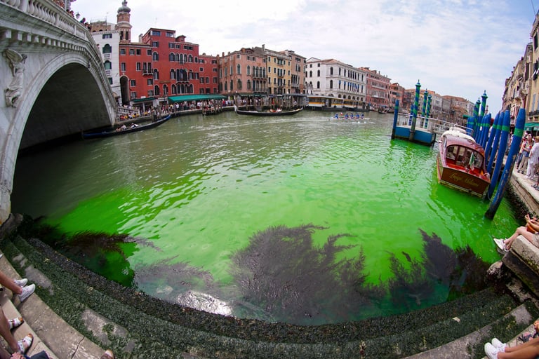 「水都」威尼斯美麗的運河全球聞名,但是這幾天,大運河(Grand Canal )的河水竟被染成一片螢光綠!乍看之下,就像是有人偷偷在這裡洗水彩筆一般。