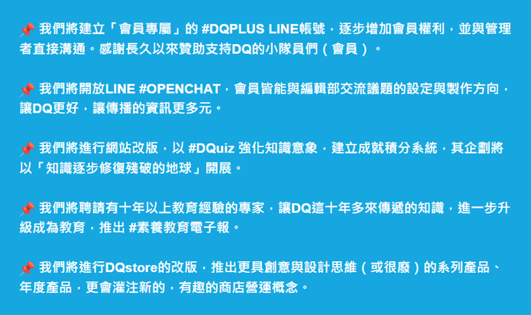 下半年開始,DQ除了持續耕耘好報導,更會以新的品牌意象「知識、教育、行動」為核心,認真做好這些事,並且賠錢做(老闆對不起,但也謝謝你):