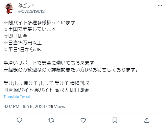 而警視廳認為多數應徵暗黑打工的,都是被「高額報酬」等甜言蜜語所迷惑。對方會以「我們團隊從來沒有人被捕過」或是「你們還這麼年輕,即使被抓也會被關在少年觀護所一年而以」等話語說服年輕人加入。
