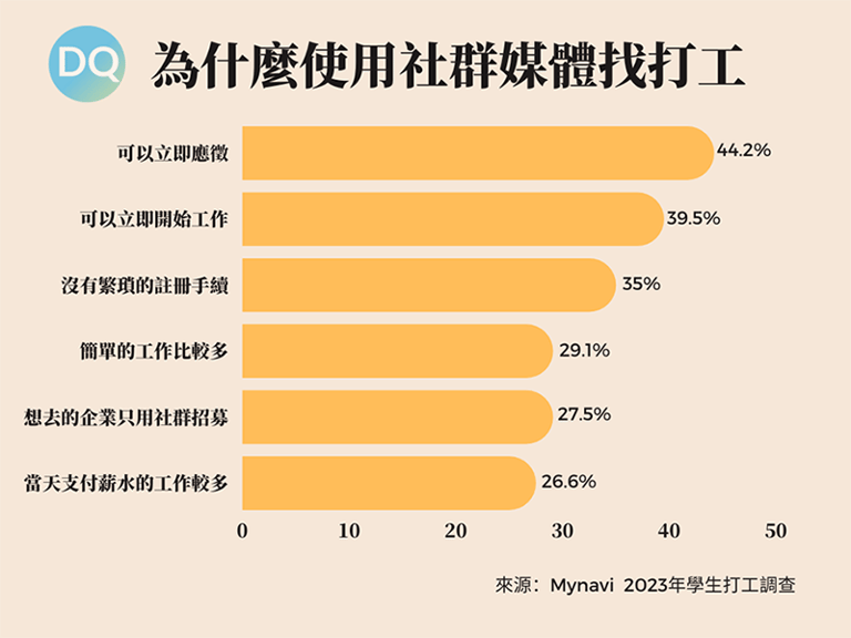 根據就職網站mynavi最新的調查,會使用社群媒體找打工的高中生佔50%、大學生佔30.8%,其中高中生在社群上尋找工作、應徵、就業上的比例皆高於大學生。他們認為社群媒體找打工的優點是「可以立即應徵職位」44.2%、其次是「可以立即開始工作」39.5%、以及「沒有繁瑣的註冊手續」35%。
