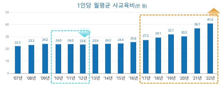 根據南韓政府的統計報告,2022年南韓民眾花費於課後補習班的支出,共高達26兆韓元(約台幣6100億元),平均每個學生每月需花費41萬韓元(約台幣9600元)補習。而根據南韓《中央日報》報導,截至今年5月為止,首爾補習班的總數為24,284家,比便利商店的數量還多出3倍。