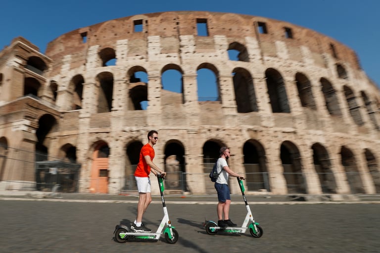 近幾年走訪羅馬競技場、萬神殿、特雷維噴泉等知名古蹟時,經常可以看到遊客騎著電動滑板車,在道路上呼嘯而過;或是在人行道上,看見成堆隨處停放的滑板車。為了遏止電動滑板車製造的交通混亂,羅馬政府先前就已出手管制;27日,義大利政府又頒布新規,嚴格限制電動滑板車的使用。