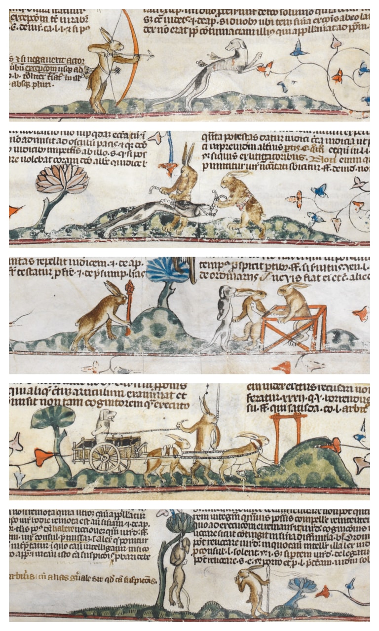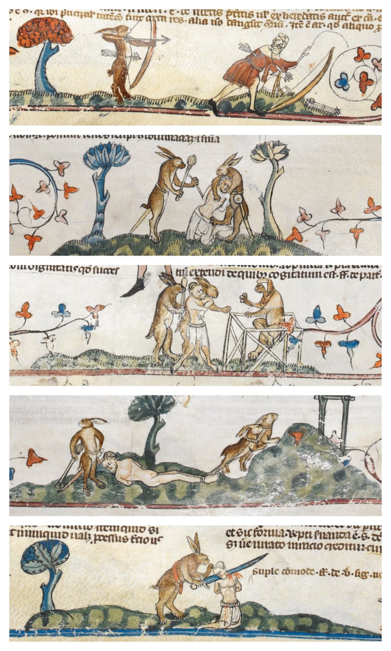 文稿中有個名為「兔子大逃殺」(The Hounding of the Hare)的故事是這樣開始的:一群農民相約出門去獵野兔,在一片忙亂與混亂中,人們竟然開始互相傷害。場面就此變得亂七八糟、毫無頭緒,最後,一位民眾已然精神錯亂,搞不清楚自己所為何來——當兔子跳到他的頭上時,他不禁悲從中來——他以為兔子要來扯爛他的喉嚨了。