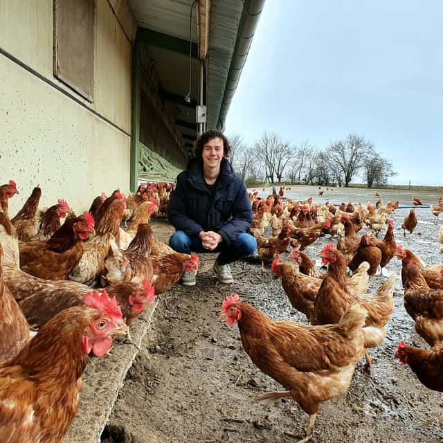 尼可拉和園藝農場主合作,每幾個月雞棚會在廣袤土地上換位置,翻土後讓農家種菜。雞隻成了天然的除草劑,雞糞則是天然肥料,零化學產品。「這是個生態體系,對我們、對雞、對農場或其他動物都很重要。」