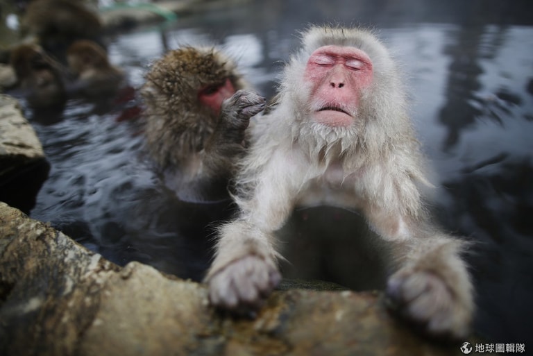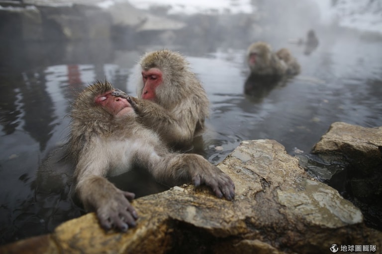 一邊感受溫泉暖意,一邊享受同伴梳毛的短尾猴
