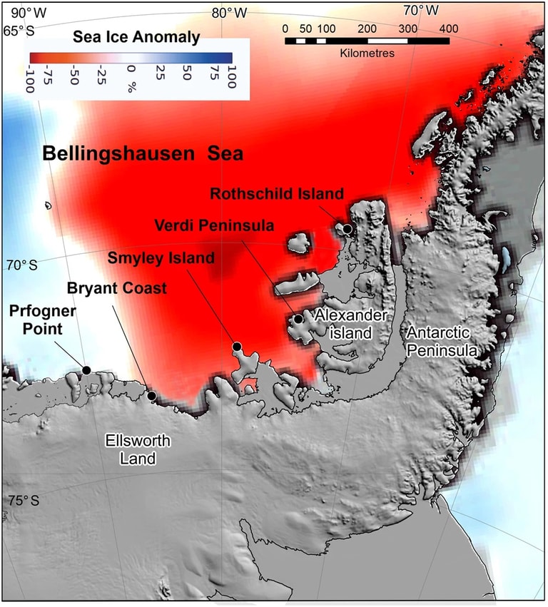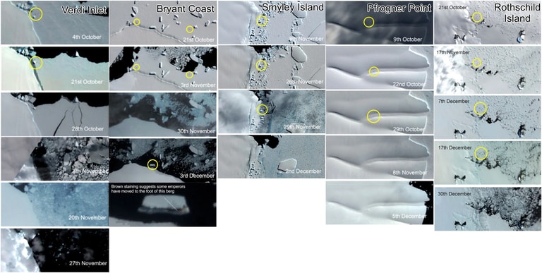 英國南極調查局的科學家於8月24日,在《通訊-地球與環境》(Communications Earth & Environment)期刊上發布一篇研究。他們利用衛星哨兵2號(Sentinel-2),觀測企鵝在白色海冰上留下的棕色糞便,以追蹤別林斯高晉海(Bellingshausen Sea)附近的5個皇帝企鵝聚落。
