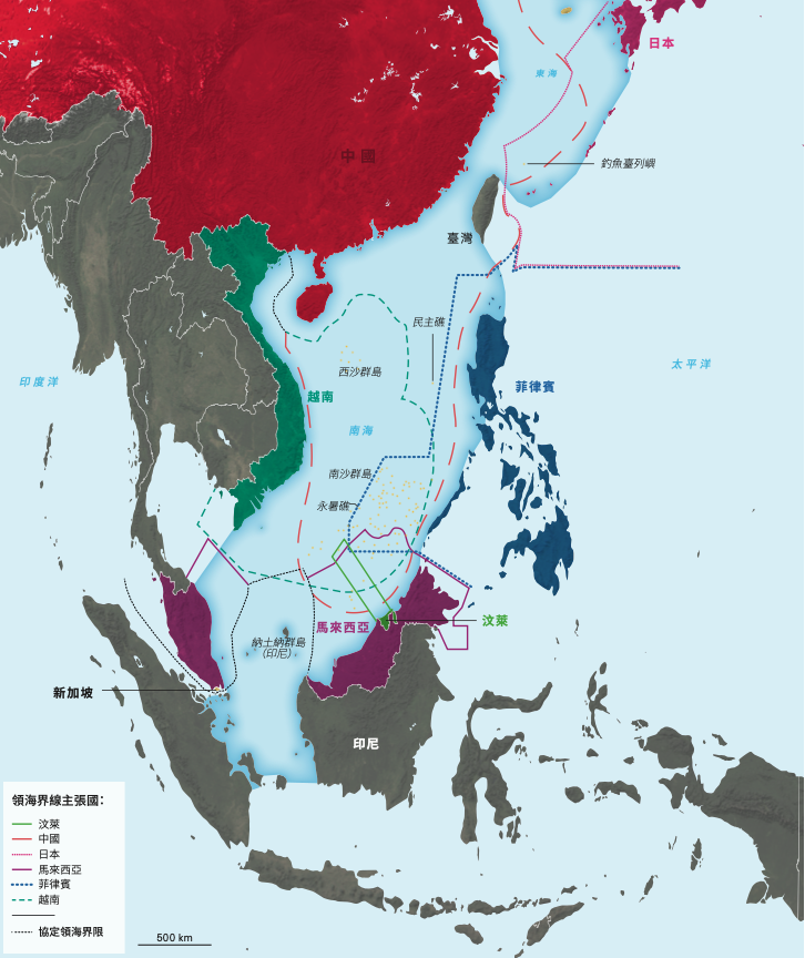 在中國沿海,中國鎖定的海域和數個臨海國家主張權利的區域互相抵制,包括日本、菲律賓、馬來西亞、汶萊和越南。因此,每個蕞爾小島或水落石出的群島鏈都成了權力棋盤上攸關利害的棋子,因為一旦經過整頓和人力進駐,這些小島就會將200海哩的專屬經濟海域往外推。這就是為什麼釣魚臺列嶼座落在日本沖繩和中國外海600公里之外,現在屬於日本管轄,卻時常上演中日兩國船艦對峙的戲碼。